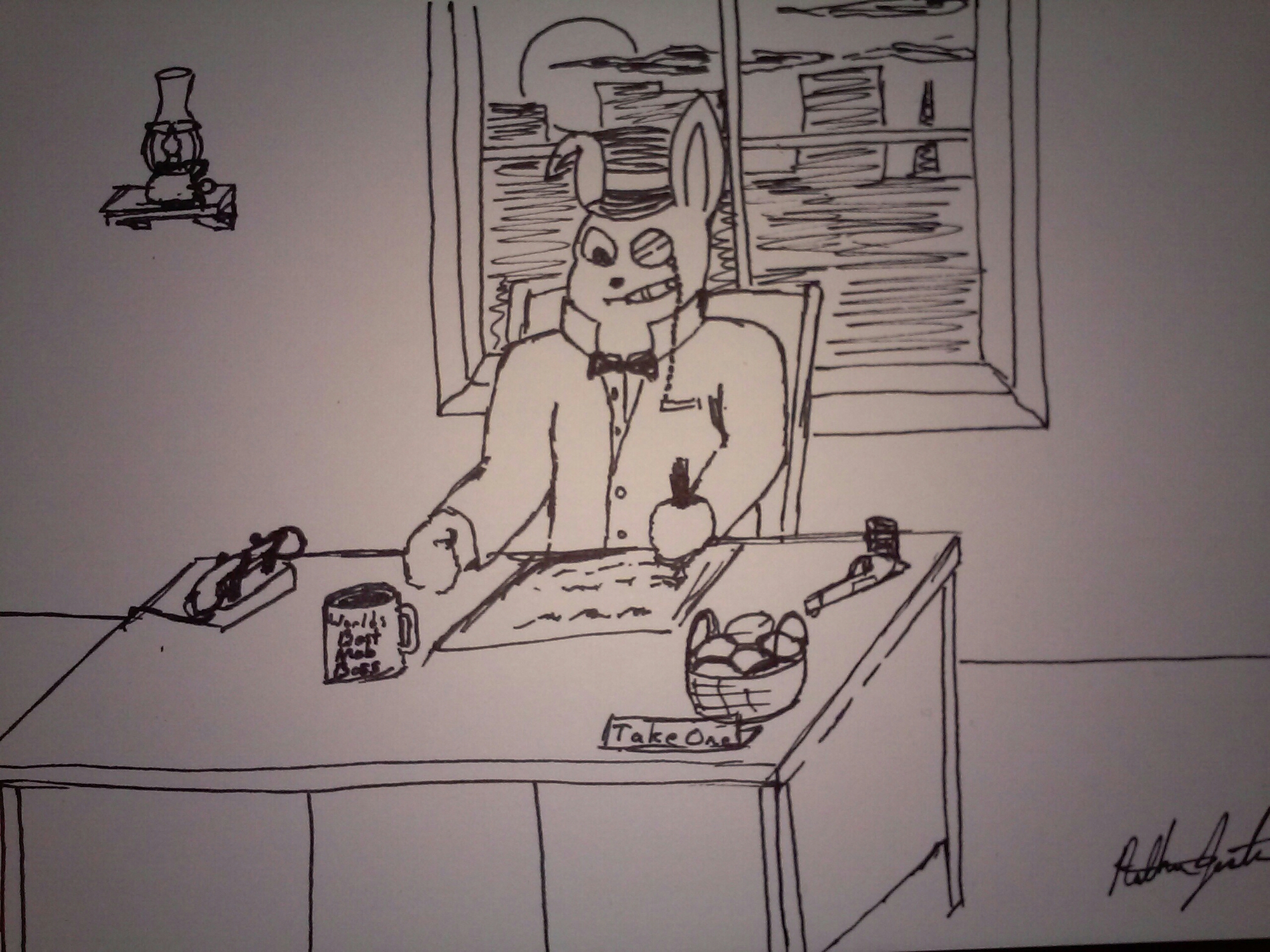 A lovely pic of the easter bunny as a mob boss. I’d like to incorporate this into a common someday. I’ve got the face down but I still need to get more comfortable drawing his jacket and hands (which you can probably guess from all the sketch marks).